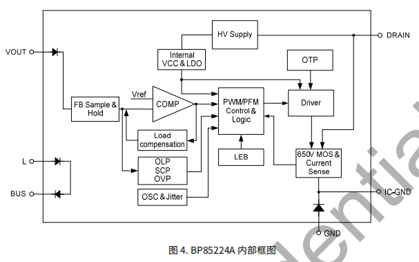高压MOSFET:内部集成650V高压MOSFET,减少外部元件数量。