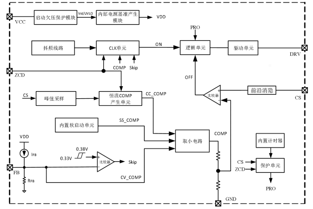 MPCM(最小峰值电流调制):当 FB 电压 < 0.8 V 并持续 1 ms 时,芯片自动抬高 CS 参考 200 mV,同时延展死区至 35 μs,实现“降频不降功率”的平滑过渡。