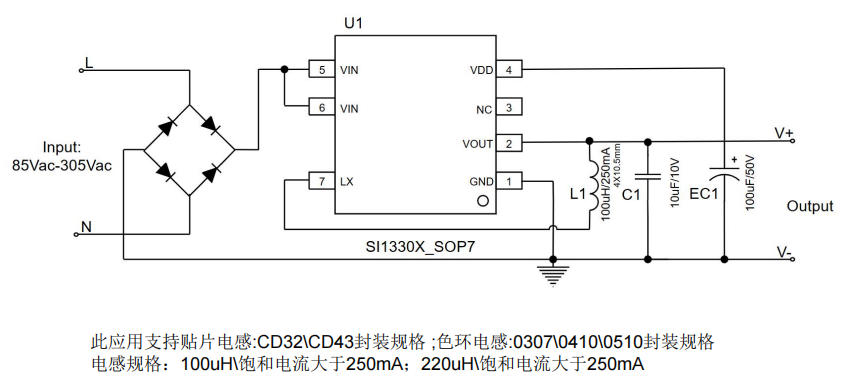 220V→保险丝→整流二极管1N4007→100μH电感(CD43)→10μF/10V陶瓷+100μF/50V电解→SI1330X→3.3V/5V