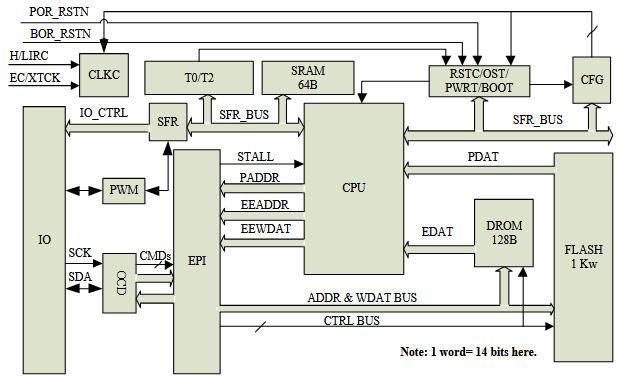 | Flash | 1K ×14 | 0x000-0x3FF,最后 16 字为中断向量 |