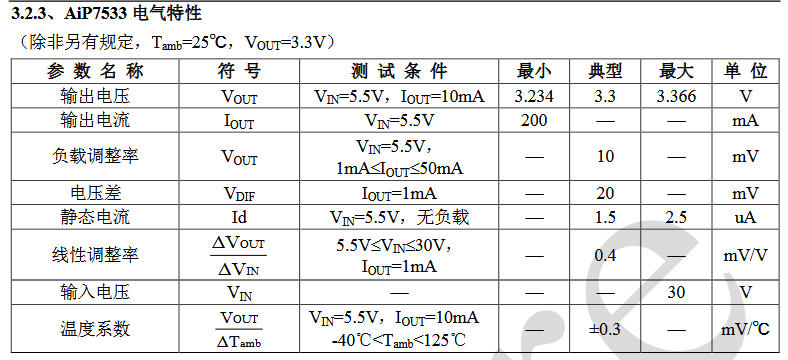 AiP75XX 家族共有 7 位成员:2.5 V、3.0 V、3.3 V、3.6 V、4.0 V、4.4 V、5.0 V,后缀“33”即代表 3.3 V 固定输出。全系采用 30 V 高压工艺,压差仅 20 mV@1 mA,静态电流 1.5 μA,堪称“电池供电界的细水长流”。