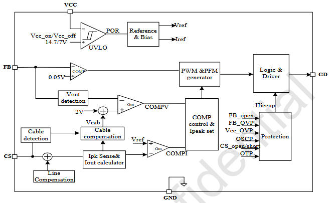 | 4 | CS | 原边电流检测,500 mV 阈值,350 ns LEB |