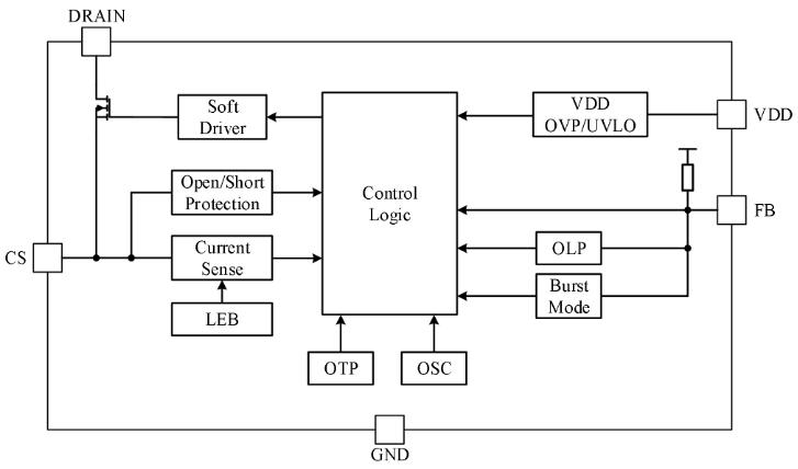 FB - 副边光耦直接拉低此脚即可实现恒压;当 VFB < 1.4 V 进入降频,< 1.0 V 进入 burst,空载无噪音。