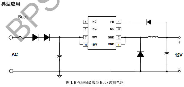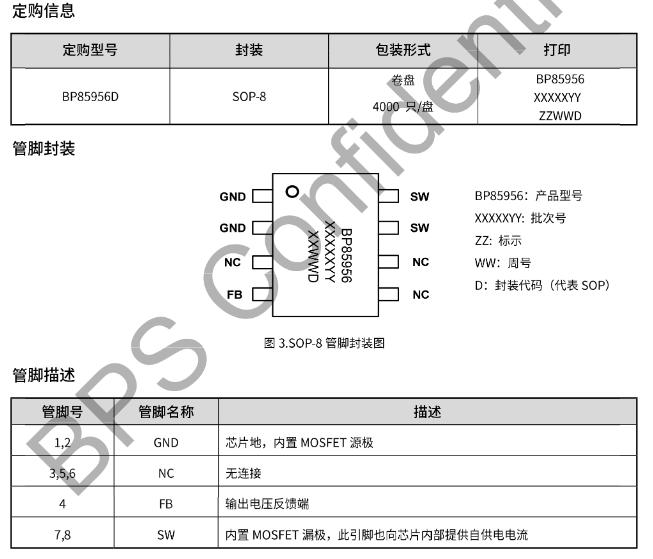 SOP-8封装,丝印“BP85956D”下面还有一行小字“YYWWX”,内部批次码。管脚定义如下(顶视图逆时针):