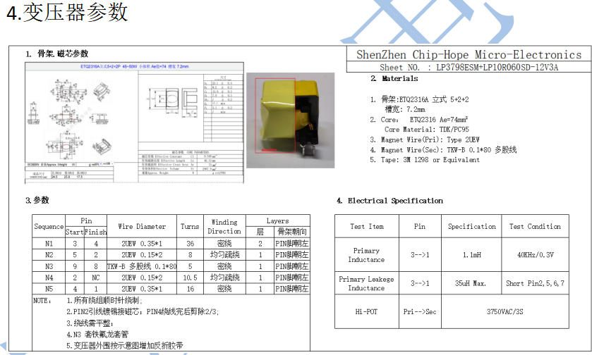 | 线规 | 0.31mm×65Ts(原边),0.7mm×6.5Ts(次级) |