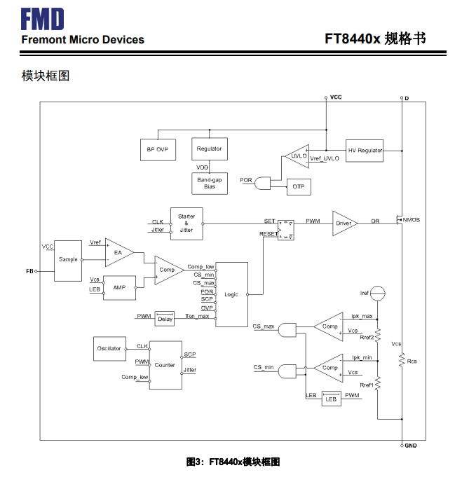 FT8440E采用超高压工艺,内部集成高压启动电路,高压功率开关,以及电流采样电阻,减少了外部元器件,极大地简化了系统应用。内置的频率抖动和软驱动设计能有效提高EMI性能。