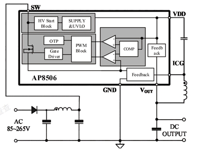 AP8506基于高压同步整流架构,集成PFM控制器以及650V高可靠性MOSFET,用于外围元器件极精简的小功率非隔离开关电源。AP8506内置730V高压启动,实现系统快速启动、超低待机功能。该芯片提供了完整的智能化保护功能,包括过流?;?,欠压?;ぃ卤;?。另外AP8506具有优异的EMI特性。