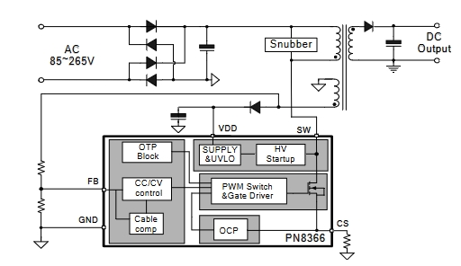 PN8366为原边反馈工作模式,可省略光耦和TL431。内置高压启动电路,可实现芯片空载损耗(230VAC)小于30mW。在恒压模式,采用准谐振与多模式技术提高效率并消除音频噪声,使得系统满足6级能效标准,可调输出线补偿功能能使系统获得较好的负载调整率;在恒流模式,输出电流和功率可通过CS脚的电阻进行调节。该芯片提供了极为全面的智能?;すδ?,包含逐周期过流?;?、过压?;?、开环?;?、过温?;?、输出短路保护和CS开/短路?;さ?。