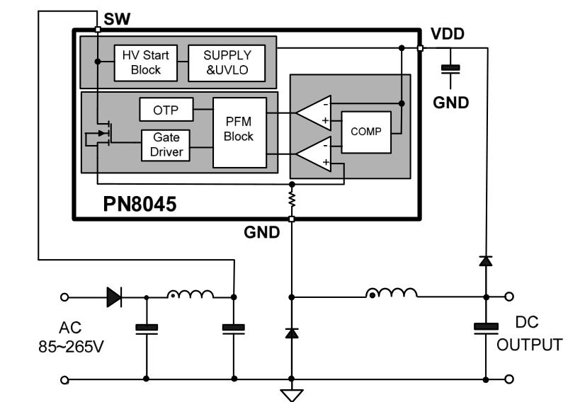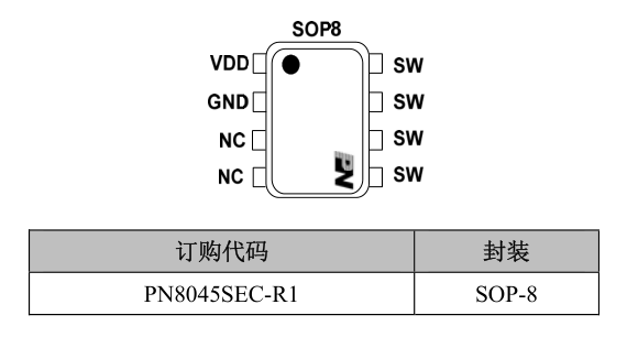 PN8045集成PFM控制器及650V高雪崩能力智能功率MOSFET,用于外围元器件较简的小功率非隔离开关电源。PN8045内置启动??椋迪窒低称舳?、待机功能。该芯片提供了智能化?;すδ?,包括过载?;ぃ费贡;ぃ卤;ぁA硗釶N8045的降频调制技术有助于EMI特性。