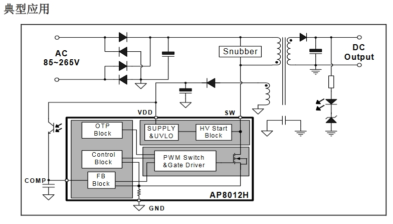 AP8012H芯片内部集成了脉宽调制控制器和功率MOSFET,适用于小功率离线式开关电源。该芯片提供了完整的智能化?;すδ?,包括过流?;?,欠压?;?,过压保护,过温?;ず腿砥舳δ堋<湫ぷ髂J侥芄唤档拖低炒τ诖J绞钡墓?;抖频技术有助于EMI特性。该芯片还内置高压启动???,保证系统能迅速启动。