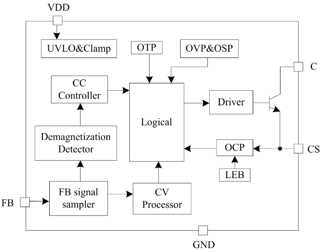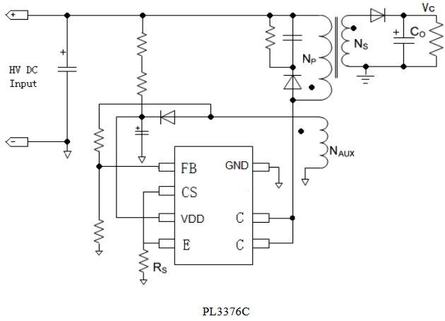 PL3376C是一款原边控制,用于反激式开关电源的恒流/恒压调节器。其高度集成了功率开关,并通过去除光耦以及次级控制电路,在简化充电器/适配器等传统的恒流/恒压设计的同时实现了精确的电流和电压调节,内部框架图如下所示。