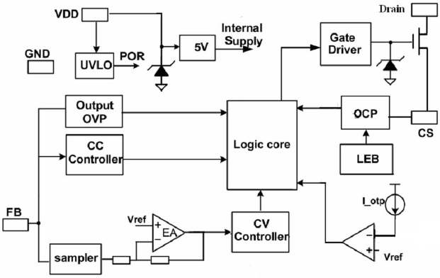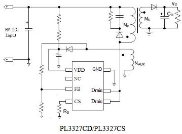 PL3327CS 是一系列高效率、高集成度、原边调节的 PWM功率开关,其主要应用于小于 18W 的 AC/DC 反激式开关电源。PL3327C 通过去除光耦以及次级控制电路,简化了充电器/适配器等传统的恒流/恒压的设计,从而实现高精度的电压和电流调节,内部框架图如下所示
