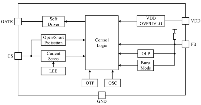 芯片通过对输出采样并反馈到光耦获得高精度的恒压输出。内置的斜率补偿电路确保了峰值电流??刂频奈榷ㄐ?。内部集成的频率抖动功能可以改善EMC,降低EMI滤波成本。
