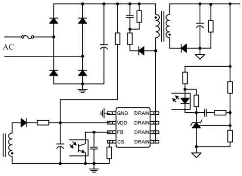 芯片通过对输出采样并反馈到光耦获得高精度的恒压输出。内置的斜率补偿电路确保了峰值电流模控制的稳定性。内部集成的频率抖动功能可以改善EMC,降低EMI滤波成本。