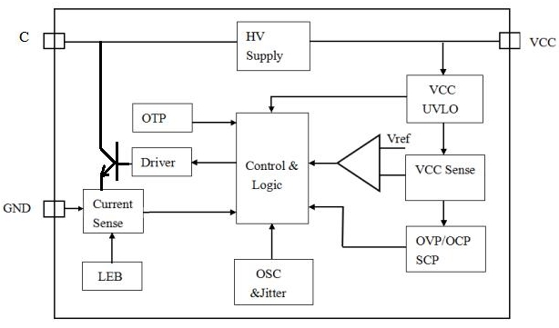 其内部集成了650V功率开关,采用专利电压电流控制技术,无需外部电压反馈和电流侦测电路即可实现精确的电压和电流调节,并可实现两种输出电压选择,极大的方便客户使用。