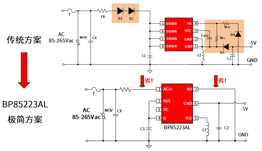 BP85223AL 芯片采用多模式控制技术,降低系统待机功耗,提高效率和动态性能,减小系统工作在轻载时的噪声。