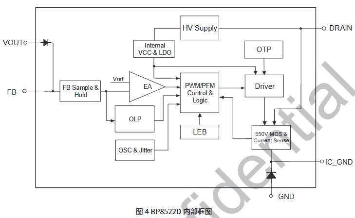BP8522D内部集成了550V高压MOSFET、高压启动和自供电电路、电流采样电路、电压反馈电路以及续流二极管,采用先进的控制技术,无需外部VCC电容和环路补偿即可实现优异的恒压输出特性,极大地减少了外围器件数量,节省了系统成本和体积,同时提高了可靠性。