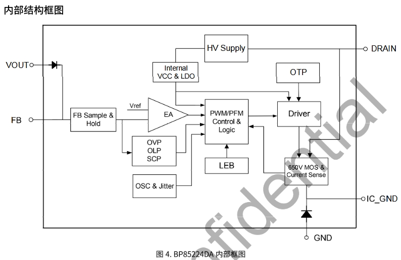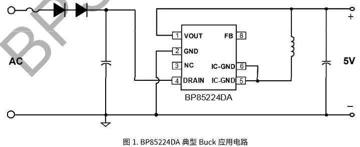 BP85224DA 是一款高性能、高集成度、低待机功耗的开关电源驱动芯片,适用于全电压 85~265VAC 输入的 Buck、Buck-Boost 变换器拓扑应用。 BP85224DA 内部集成了 650V 高压 MOSFET、高压启动和自供电电路、电流采样电路、电压反馈电路以及续流二极管,采用先进的控制技术,无需外部 VCC 电容和环路补偿即可实现优异的恒压输出特性,极大地减少了外围器件数量,节省了系统成本和体积,同时提高了可靠性。