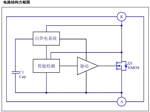 DK5V100R10HM是一款简单高效率的同步整流芯片,只有A,K两个引脚,分别对应肖特基二极管的PN管脚。芯片内部集成了100V功率NMOS管,可以大幅降低二极管导通损耗,提高整机效率,取代或替换目前市场上等规的肖特基整流二极管。DK5V100R10HM采用SM-10封装。内部框架图如下所示~