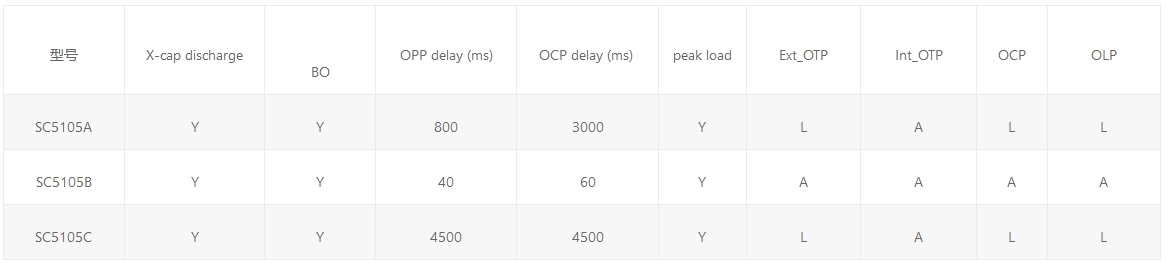 SC5105是一款集成高压启动与X-CAP放电功能的高性能电流模式PWM控制器,具有BO、OPP和OCP保护和锁死功能,提高了系统的安全性。为适应峰值负载,提供了峰值功率输出功能;高低压补偿技术减小了高低压OCP的差异;独特的频率抖动技术和GATE软驱动技术,改善了系统EMI性能。