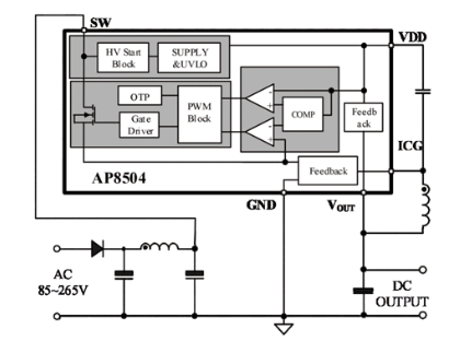 AP8505同样基于高压同步整流架构,集成PFM控制器以及500V高可靠性MOSFET,用于外围元器件极精简的小功率非隔离开关电源。AP8505的特点包括: