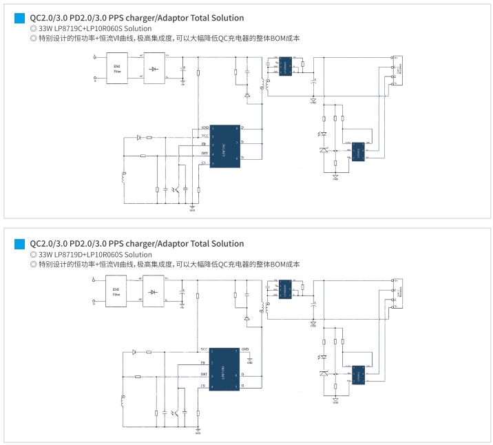 LP8719C/D是一款高效的PWM控制器,它支持33W的输出功率,并能够根据设备的充电需求动态调整输出电流和电压。这款控制器的恒功率+恒流VI曲线设计,确保了充电过程中的稳定性和效率。