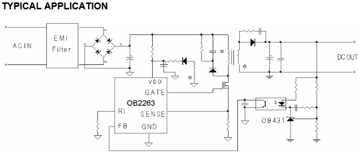 OB2263的启动电流低至3uA,工作电流约为1.4mA,有效降低了系统的损耗,提高了系统的效率。