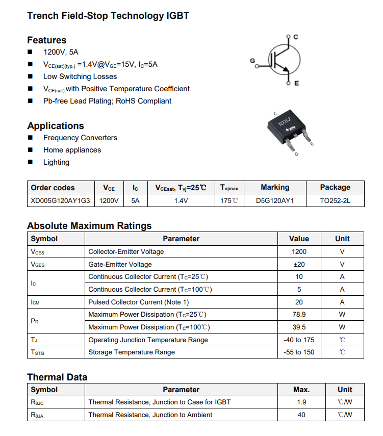XD005G120AY1G3 国产IGBT 芯达茂 5A 1200V TO-252-3L