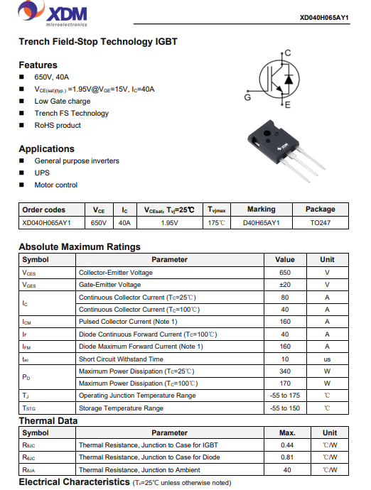 芯达茂XD040H065AY1S3国产IBGT +FRD单管 40A 650V TO-247-3L