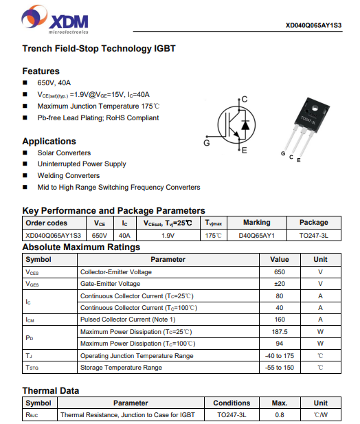 XD040Q065AY1S3芯达茂 国产IBGT +FRD单管 40A 650V TO-247-3L