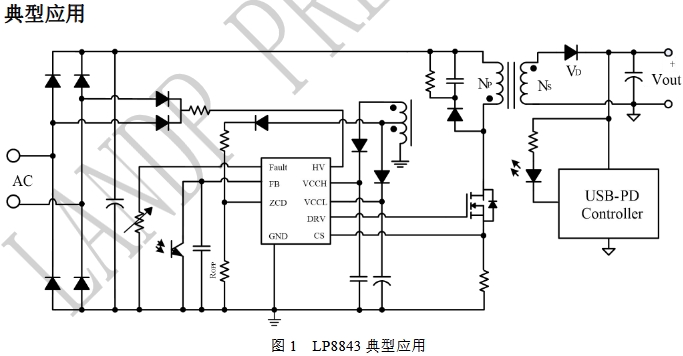 LP8843推荐应用功率为36W至150W,这覆盖了从小型个人电子设备到较大功率需求的电子设备的广泛应用。其高效率的电源管理能力,使其在PD快充和AC-DC适配器等领域中表现出色。